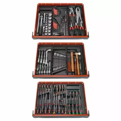 - Composition cliquet – douilles 1/4 avec douilles de 5,5 à 14 mm, rallonges, cardan, poignée tournevis, jeu de 9 clés 6 pans de 1,4 à 8 mm, jeu de 8 clés torxplus de 10 à 45, jeu d’embouts plats,Phillips Pozidriv Résistorx