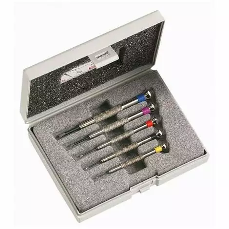 - 5 Tournevis pour vis à fente : 0,8×13 – 1×16 – 1,2×17 – 1,6×19 – 2,5×21 mm.